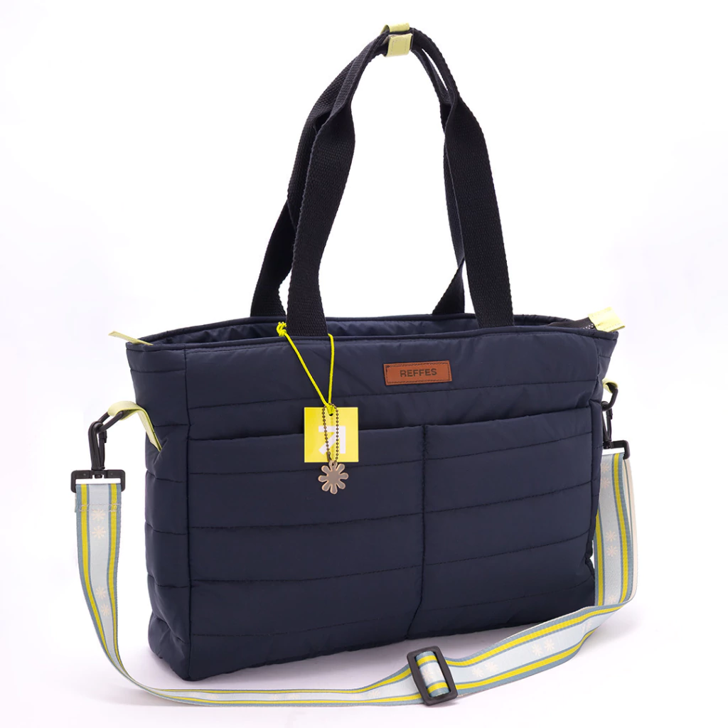 Bolso Sofía de estilo urbano con diseño en matellasse en color azul marino, ideal para combinar practicidad y estilo. Incluye dos asas cortas de tela resistente y una correa desmontable regulable con estampado zigzag en tono camel. El detalle en naranja en los bordes y el gancho de la correa le suma un contraste atractivo. Perfecto para uso diario gracias a su amplio espacio interior y su funcionalidad.